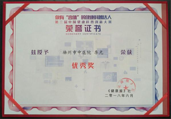 近日,第三届全国“新时代”健康科普作品征集大赛(讲解类)在北京科学技术馆举行了颁奖典礼,徐州市中医院医生李尤的演讲视频作品《防癌养生中医说》力压群雄,荣获优秀奖,并跻身全国50强,为医院赢得了荣誉。