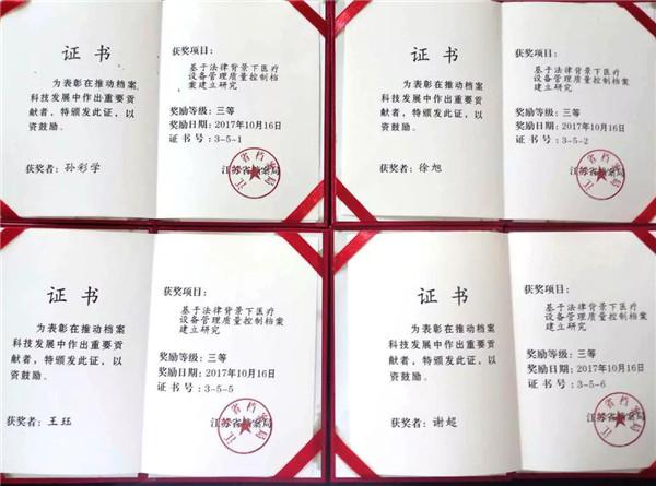 近日,徐州市第一人民医院设备处孙彩学、徐旭、谢超和院办公室王珏同徐州市档案局共同申报的的课题《基于法律背景下医疗设备管理质量控制档案建立研究》荣获江苏省档案局优秀科技成果三等奖。