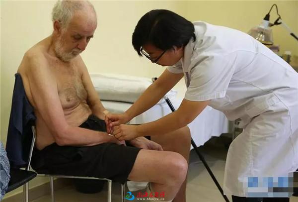 8月17日,在马耳他保拉的地中海地区中医中心,第14期中国援马耳他医疗队成员安静(右)为病人进行针灸治疗。