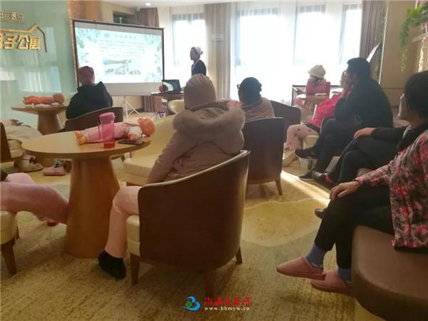 在新生儿护理的小课堂上,讲师给宝爸宝妈们配备了模型宝宝,边结合课件讲解边亲自演示,教给新手爸妈们护理宝宝的各种实用小技能。