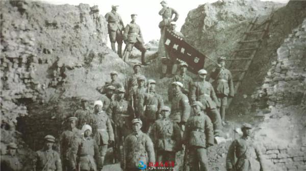 (这张珍贵的老照片是八连仅剩的14名突击队员与战友们在宿县城头上的一张合影)
